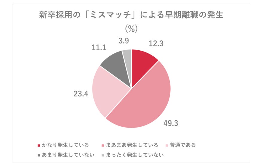 ミスマッチによる早期離職の発生を聞いたところ、「あまり発生していない」「まったく発生していない」と回答した企業を除くと85.0%となった。また、「かなり発生している」「まあまあ発生している」と答えた企業は合計で61.6%であり、過半数の企業で想定以上にミスマッチが発生していることがわかった。