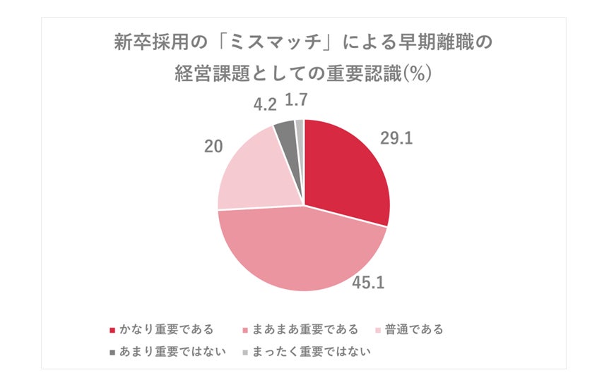 ミスマッチによる早期離職の経営課題としての重要認識を聞いたところ、「かなり重要である」「まあまあ重要である」「普通である」と答えた企業の合計は94.2%にのぼった。なかでも、「重要である」と答えた企業は74.2%であり、企業は対応が求められている。