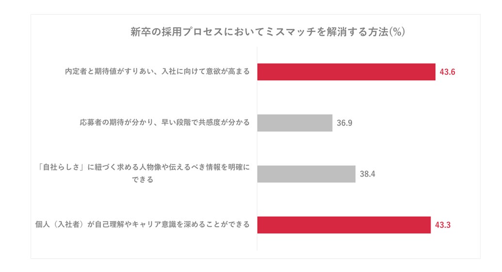 ミスマッチを解消する方法について、「内定者と期待値がすり合い、入社に向けて意欲が高まる」を挙げた企業は43.6%、「個人(入社者)が自己理解やキャリア意識を深めることができる」を挙げた企業は43.3%だった。