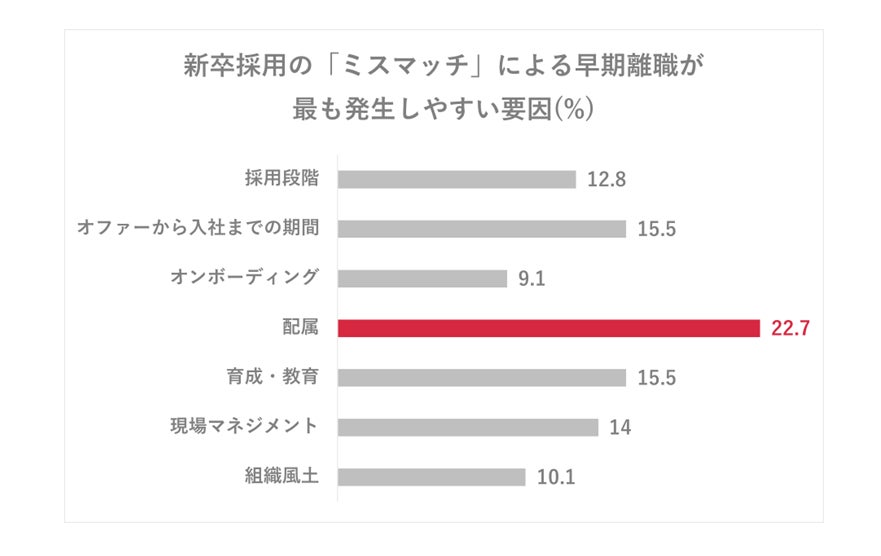 ミスマッチによる早期離職が発生しやすい要因は「配属」が22.7%と最多であり、続いて「オファーから入社までの期間」と「育成・教育」が15.5%だった。また、「採用段階」「オファーから入社までの期間」「オンボーディング」「配属」の合計が60.1%となり、配属までのプロセスに要因があると捉えている企業が過半数を超えていることがわかった。