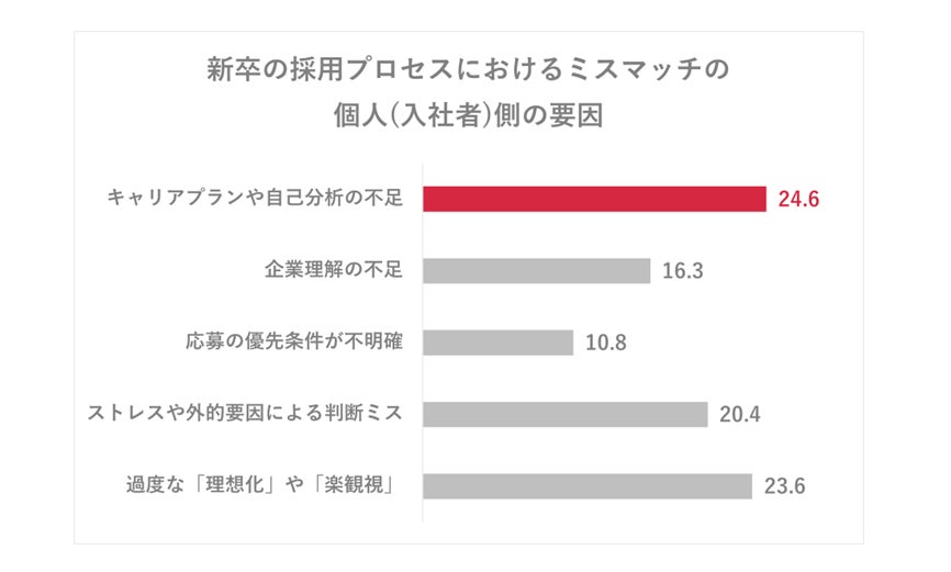 ・ミスマッチにおける入社者側の要因は「キャリアプランや自己分析の不足」が24.6%で最多だった。