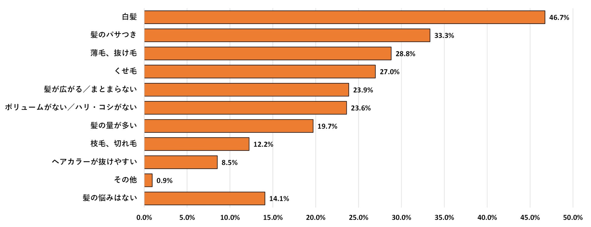 髪についてどのような悩みを抱えているか尋ねたところ、「白髪」が46.7%でトップとなり、全国的に半数近い方が悩みとして認識していることが分かります。次いで2位が「髪のパサつき」(33.3%)、3位が「薄毛、抜け毛」(28.8%)と続き、それぞれ高い割合となりました。