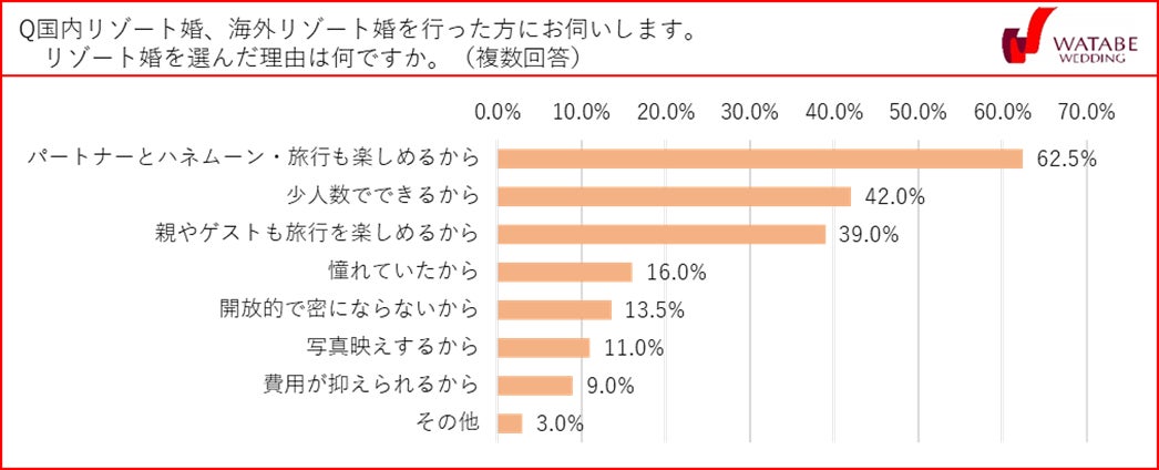 国内リゾート婚、海外リゾート婚を行った方に、リゾート婚を選んだ理由を尋ねたところ、最も多かった回答は、「パートナーとハネムーン・旅行も楽しめるから」(62.5%)でした。続いて多かったのは、「少人数でできるから」(42.0%)、「親やゲストも旅行を楽しめるから」(39.0%)でした。