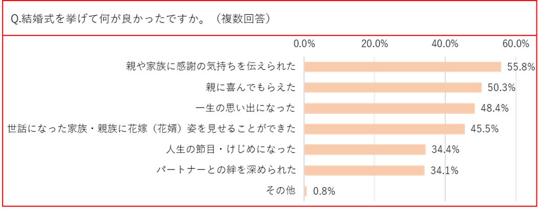 さらに、「結婚式をしてよかった」と回答した378人に、結婚式を挙げてよかったことについて問うと、1位は「親や家族に感謝の気持ちを伝えられた」(55.8%)、2位は「親に喜んでもらえた」(50.3%)、3位は「一生の思い出になった」(48.4%)でした。結婚式を挙げた理由、そして挙げてよかったことに共通して、家族や親族に関する回答が上位になりました。
