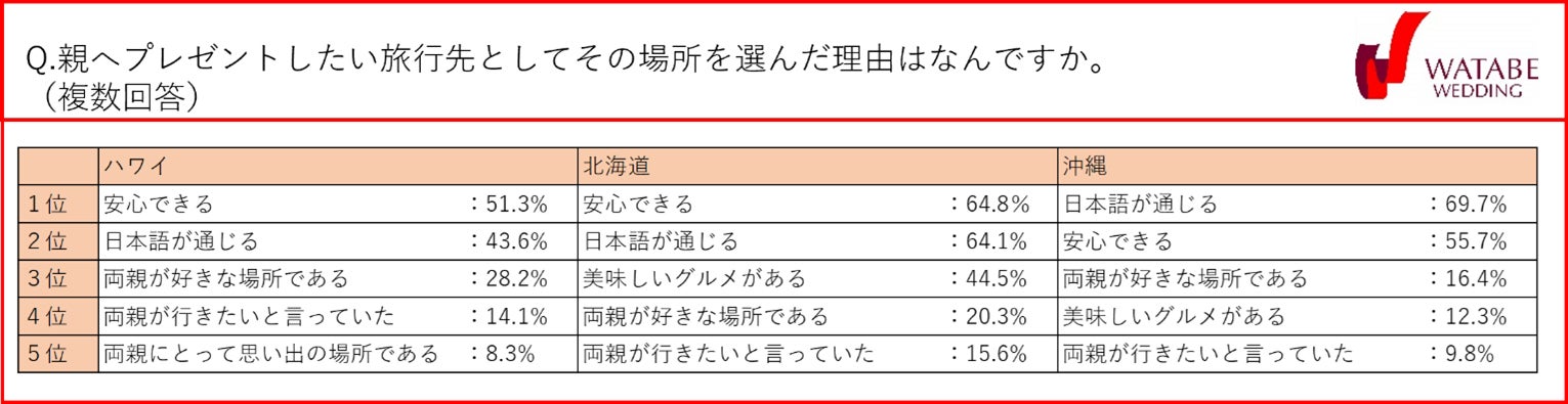 「ハワイ」「北海道」「沖縄」を選んだ理由をそれぞれ回答してもらうと、「ハワイ」では1位が「安心できる」(51.3%)で、2位に「日本語が通じる」(43.6%)、3位に「親が好きな場所である」(28.2%)がランクインしました。また、「安心できる」と「日本語が通じる」は「北海道」と「沖縄」でも1位と2位になっており、親にプレゼントをする旅行先を選ぶ際に、重視される項目であることが分かりました。