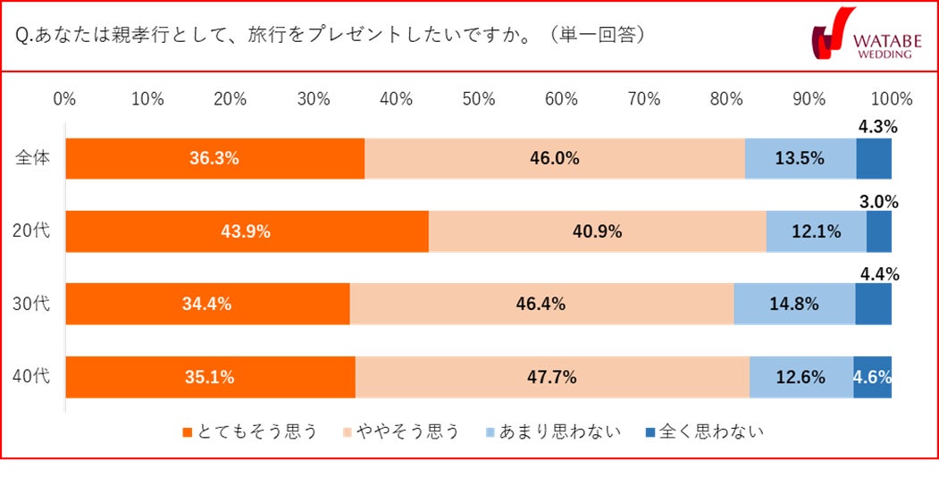さらに「あなたは親孝行として、旅行をプレゼントしたいですか」と尋ねると、全体の36.3%が「とてもそう思う」と答えており、「ややそう思う」(46.0%)と合わせると、82.3%が、旅行をプレゼントしたいと答えました。年代別では、旅行をプレゼントしたいと答えた割合は、20代が最も高く、特に「とてもそう思う」(43.9%)と回答した人が他の年代に比較し多くなりました。「ややそう思う」(40.9%)を含めると、20代の84.8%が親に旅行をプレゼントしたいと考えていることが判明しました。