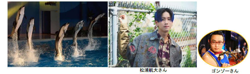 カマイルカとバンドウイルカの躍動感あふれるスピーディーな動きや、シロイルカとショートレーナーが織りなす水中パフォーマンスなど、イルカたちの動作や行動を活かしたさまざまなパフォーマンスと「松浦航大」さんによる変幻自在の7色ボイスとの共演をお楽しみください。また、コミカルなタンバリンさばきで世界を魅了した芸人「ゴンゾー」さんも登場し、会場をより一層盛りあげます!