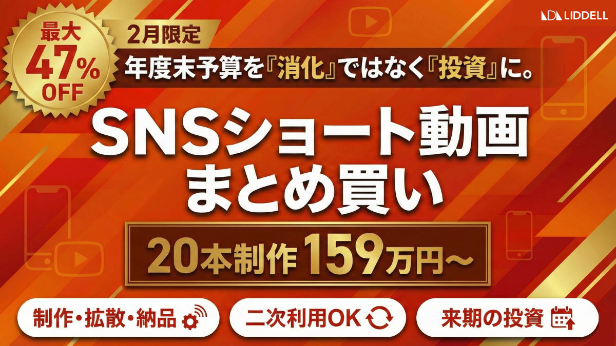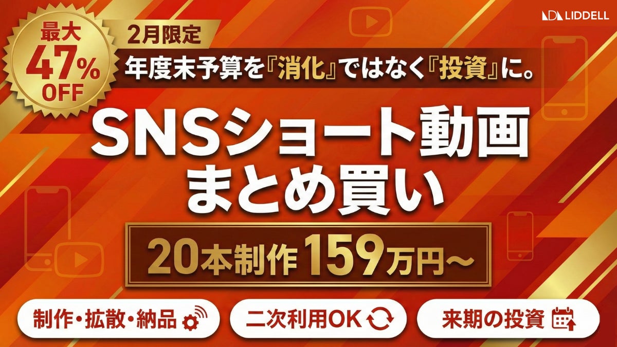 SNS・インフルエンサーマーケティングを中核に、ファン・コミュニティとAIを掛け合わせた「人を基軸としたマーケティング事業」を展開するLIDDELL株式会社(本社:東京都港区、代表取締役:福田 晃一、以下リデル)は、年度末の予算最終調整時期に合わせ、インフルエンサーがSNS用ショート動画( 15〜60秒)を企画・制作し、投稿拡散まで行う《SNSショート動画拡散・納品キャンペーン》を開始しました。期間中に複数本をまとめてご発注いただくことで、1本あたりの制作費が最大 47%OFFとなります( 2月中のご発注に限る)。