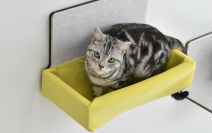 「猫壁」は、自宅の壁に愛猫の性格や成長に合わせて自由に高さやレイアウトをアレンジできる、マグネット脱着式のキャットウォークです。今回発売される新パーツの「ハンモック」は、愛猫がすっぽりと入ることができる大きさで、しっかりと支える安心感のある形状により愛猫の身体を優しく包み込みます。また、その日の気分やインテリアに合わせて色を変えられるリバーシブル生地で、取り外して自宅で手洗いすることができます。