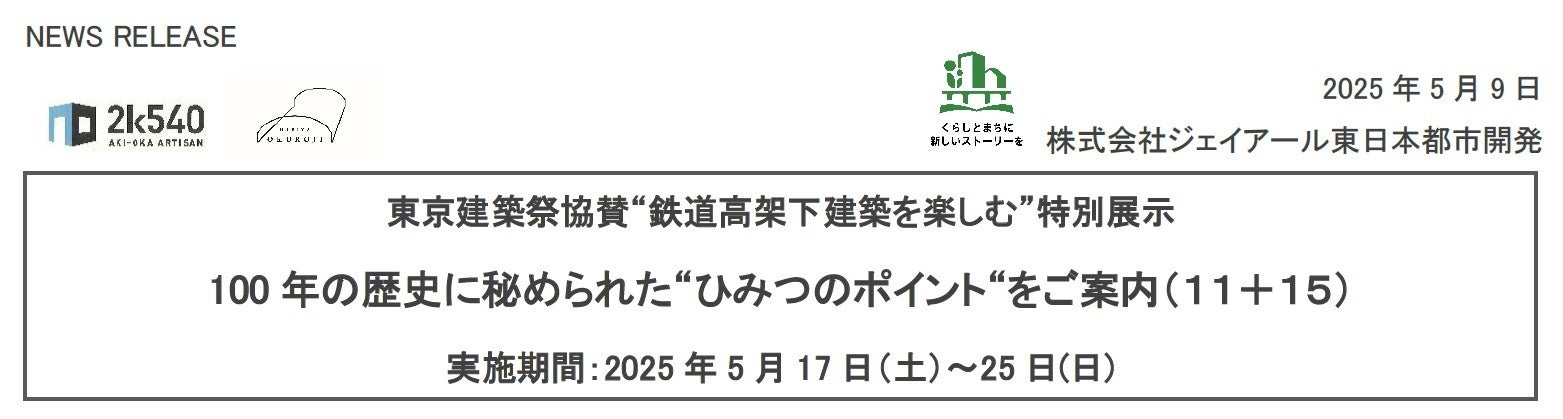 株式会社ジェイアール東日本都市開発は東京建築祭2025に協賛・参加いたします。今回は、東京を代表する鉄道高架下施設①「2k540(ニーケーゴーヨンマル):台東区」と②「日比谷OKUROJI(オクロジ):千代田区」の2施設で“特別展示”を実施いしたします。両施設ともに100年の歴史をそのまま活用した空間として一般のお客さまにご利用いただいていますが、高架下建築そのものをより楽しんでいただくための見どころ“ひみつのポイント”を公開・ご紹介する特別展示です。ひみつのポイントは、2k540は11個、日比谷OKUROJIは15個あります。ひみつのポイントを一つ一つめぐると現代の建物にはない歴史の息吹を味わえます。また、建築の視点から空間をとらえる遠藤慧氏の描きおこしイラストも拡大展示いたしますので、あわせてご注目ください。