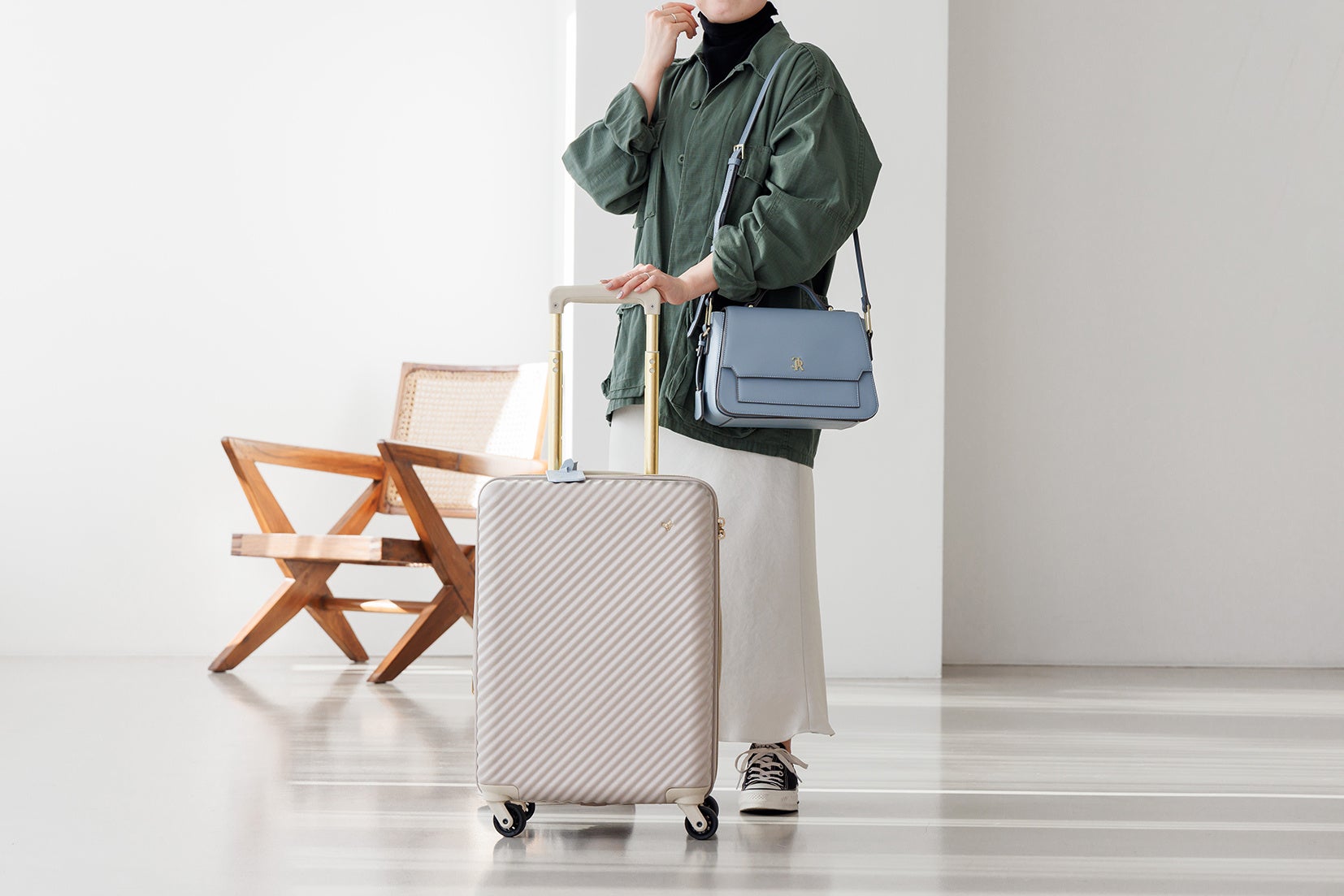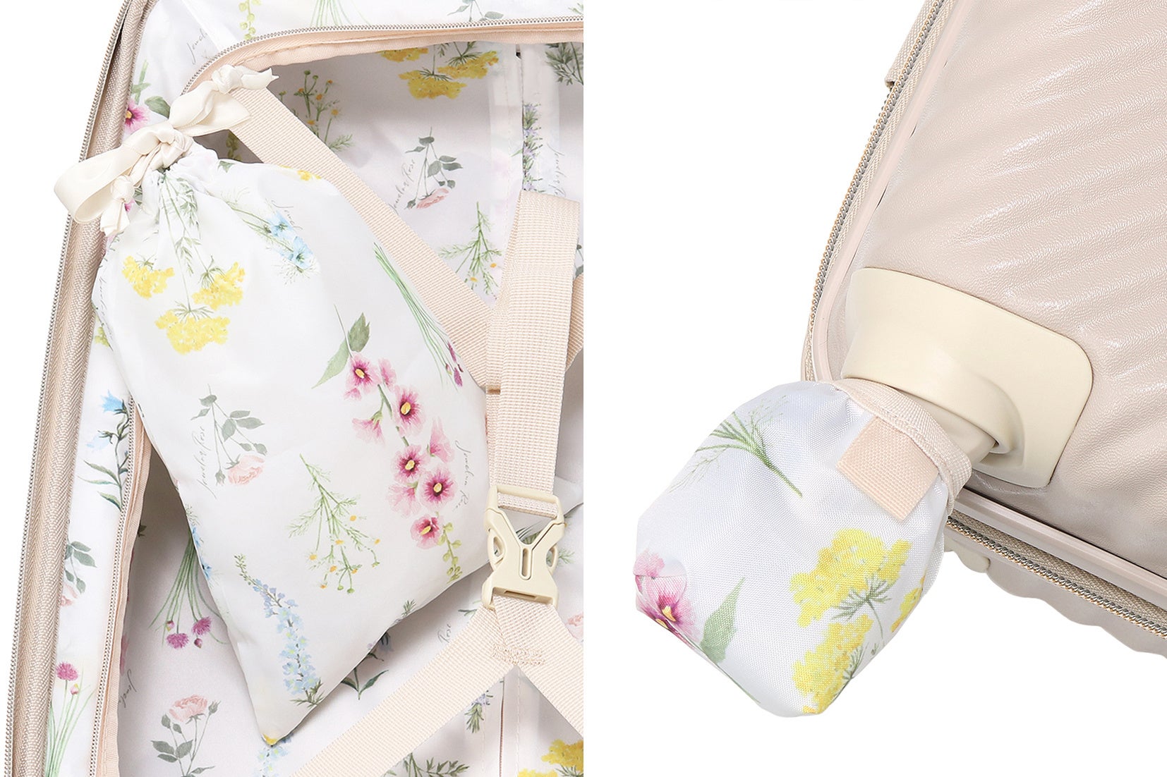 機内持込サイズにはキャスターカバーと巾着ポーチ、預け入れサイズにはシューズケースとシューキーパーのおまけ付き。