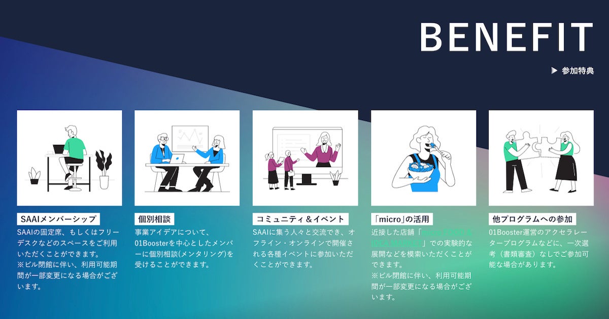 本コンテストは、第1回目から有楽町「SAAI」を提供する三菱地所株式会社が協賛。採択者は、有楽町「SAAI」の一年間無償利用をはじめ、01Boosterの個別相談(メンタリング)、各種イベントへの参加、近隣店舗での実証実験を模索できるなど、さまざまな参加特典を受けることができます。(※)
