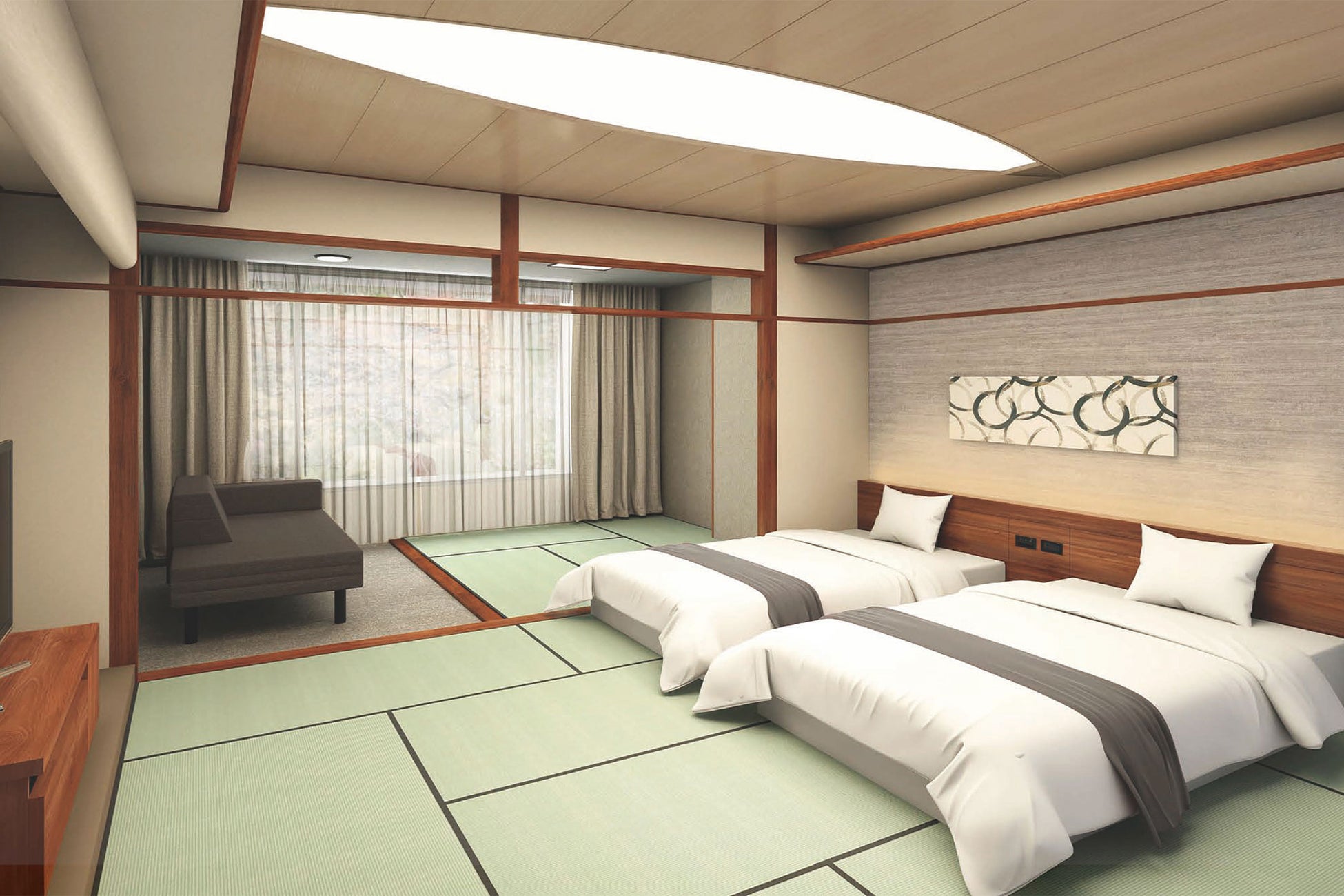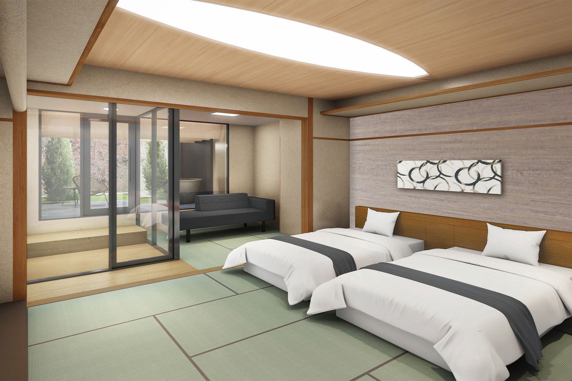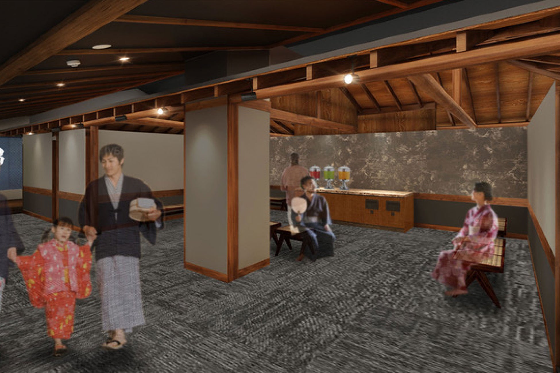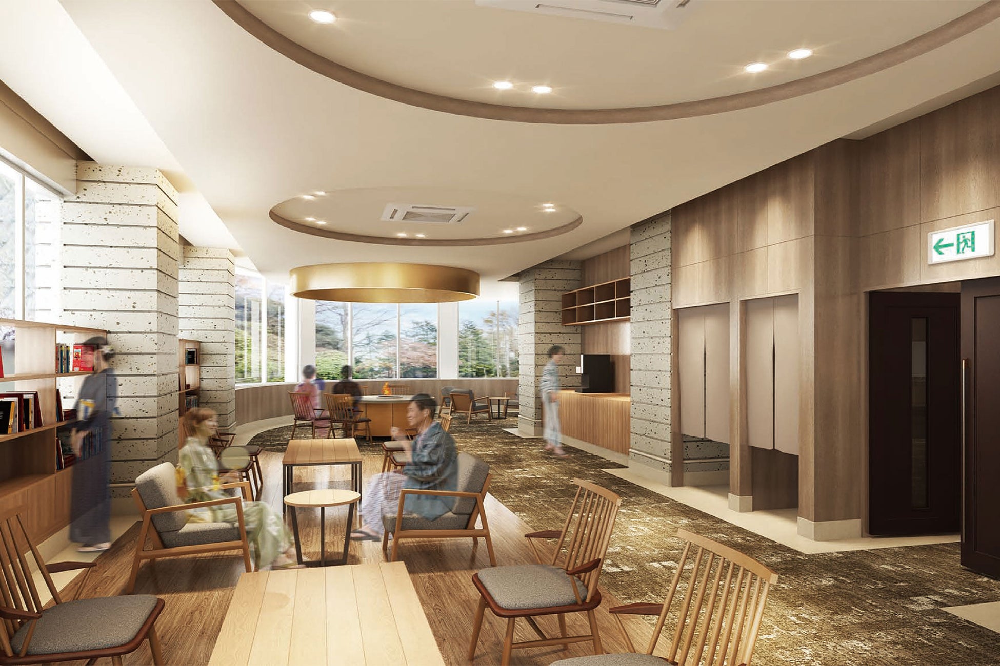 今回のリニューアルでは、より旅行を楽しんでいただけるよう、館内のいたるところにストーリー性を持たせたデザインを取り入れます。伊香保の各名所の観光を満喫したあとも、館内で伊香保の街並みの趣を感じることのできる、和の情緒とモダンが融合した宿へ生まれ変わります。