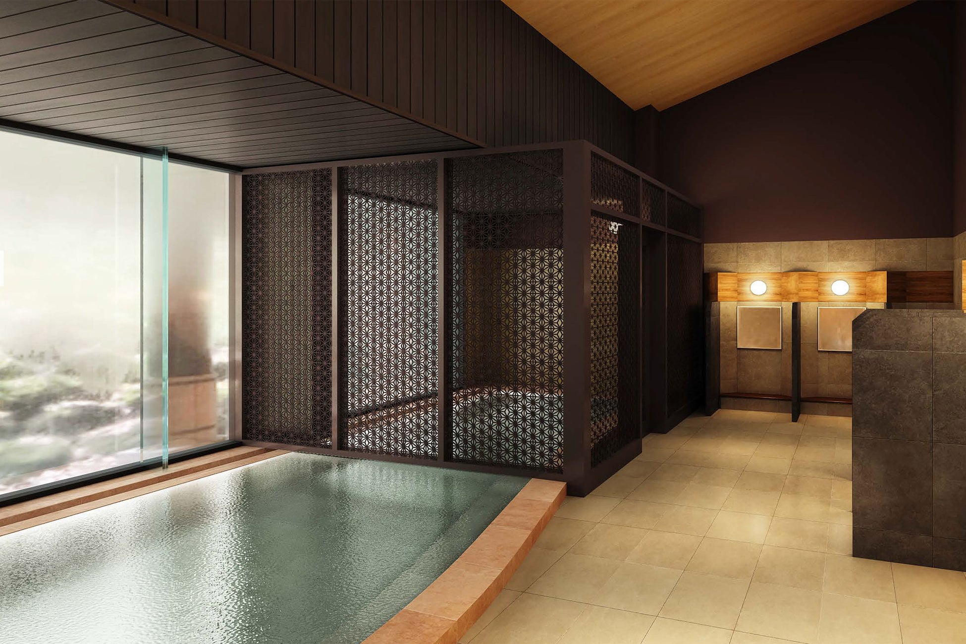 片方の内湯の一部は半露天風呂にリノベーションし露天風呂と一体化させ、もう片方の露天風呂は格子を一新するなど、今までよりも開放感のある空間で温泉をお楽しいただけます。また、洗い場に仕切りを設けるなど、使い勝手の良さにも配慮いたしました。伊香保の名湯を楽しんだ後は、大屋根をモチーフにしたデザインの和情緒あふれる湯上りラウンジでゆっくりと喉をうるおしてください。