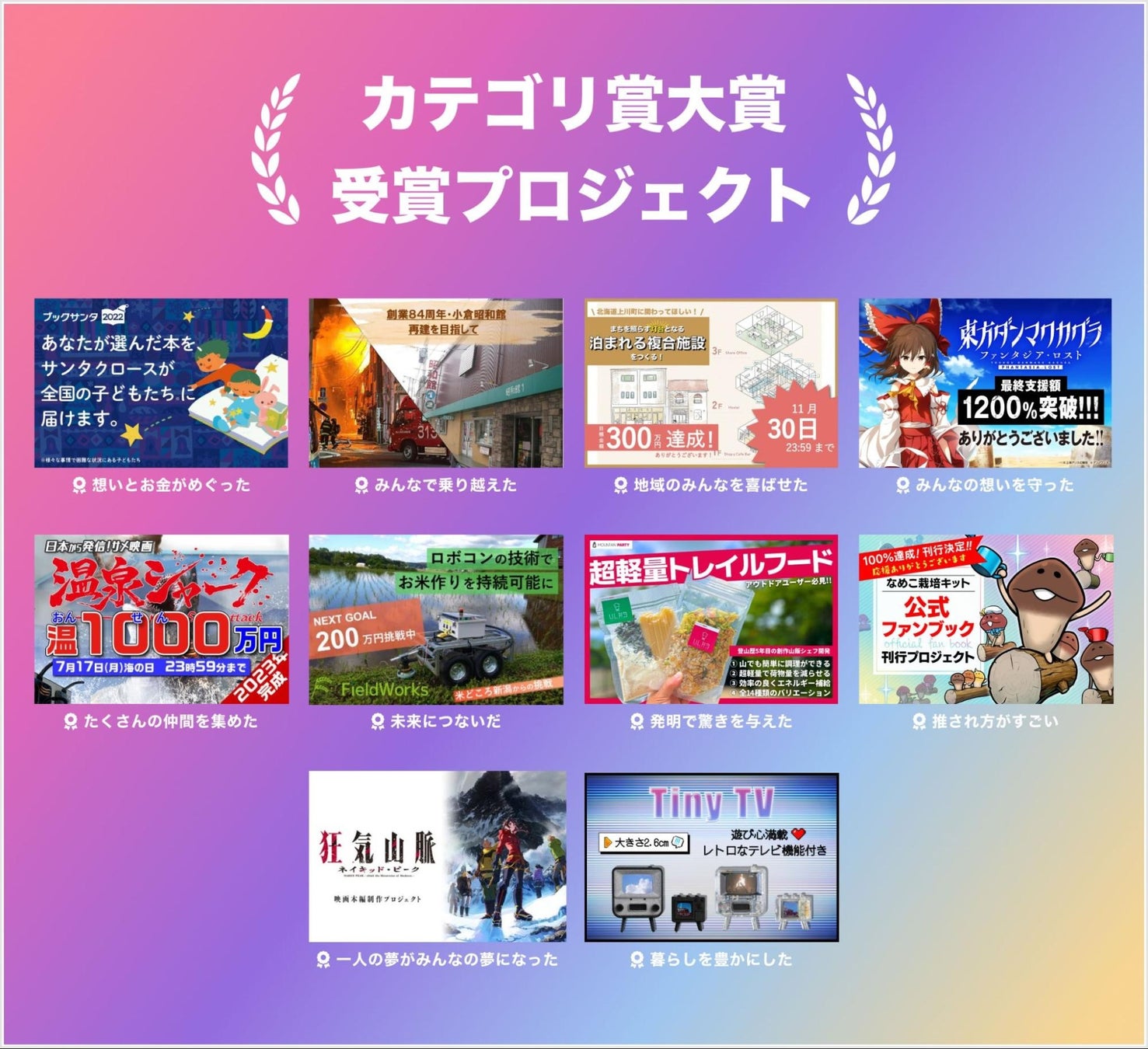 今回は、ノミネートされたプロジェクトからX(旧Twitter)を通じて募った14,000件以上の投票や、各プロジェクトの支援者数、世の中へ与えた影響などの観点から「総合賞」を含む10の表彰部門の受賞プロジェクトを決定しました。