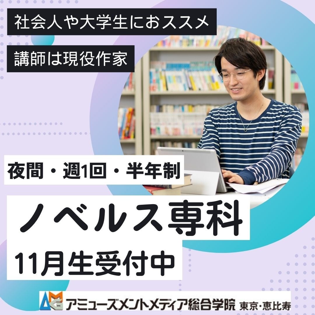 エンタメ業界のプロを育成するアミューズメントメディア総合学院(東京都渋谷区、 理事長:吉田 尚剛、 以下AMG)では、ノベルス専科11月生の募集を10月27日(金)まで新規お申込みを受付中です。