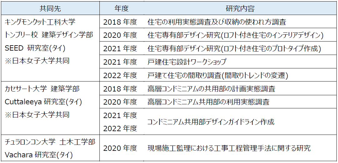 産学共同研究 | ・現地の大学と共同研究を実施 ・現地の慣習、マーケットニーズ理解及び商品性の向上を実現 ・現在、タイ(2018年度~)、ベトナム(2022年度~)の2か国で活動を展開 ・タイにおいては、キングモンクット工科大学、カセサート大学、チュラロンコン大学の現地3大学及び日本女子大学(※)と共同研究を実施 ・ベトナムにおいては、ハノイ土木大学、ハノイ建築大学の現地2大学及び日本女子大学と共同研究を始動 ・タイにおいては2018年度から5年間で合計9件の共同研究を実施 |