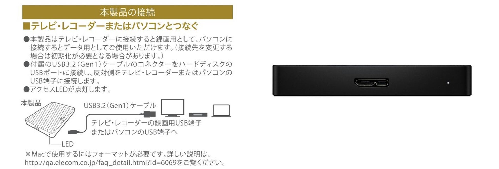 USB3.2(Gen1)/USB3.1(Gen1)/USB3.0対応で、5Gbps(理論値)の高速転送が可能です。動画や写真などの大容量データを軽快に扱うことができます。exFAT形式にフォーマット済みなので、WindowsパソコンやMacに接続するだけですぐに使用可能です。USB3.2(Gen1)/USB3.1(Gen1)/USB3.0対応のテレビに接続すれば、2番組同時録画などのさらに便利な機能も利用できます(※1)。耐久性にも優れ、24時間連続テレビ録画にも対応しています。