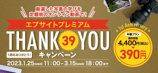 エプソン販売株式会社は、アルバム制作や作品制作でご利用いただいているプリンターだけではなく、「エプソンフォトグランプリ」などのフォトコンテスト実施やエプサイトギャラリーでの写真展開催を通じ、写真愛好家の皆さまと共に歩んでまいりました。2022年には「エプサイトプレミアム」として新しいサービスを開始し、1年を迎えることができました。そこで、より多くの方に写真をお楽しみいただくために、1周年記念として『エプサイトプレミアム 39(サンキュー)キャンペーン』を実施します。新規お申し込みの方を対象に、通常4,400円(税込)の年額プランを年額390円(税込)にてご利用いただけます。なお、「エプサイトプレミアム」の年額プランをご利用中※の皆さまには、サンキュープレゼントをお送りします。