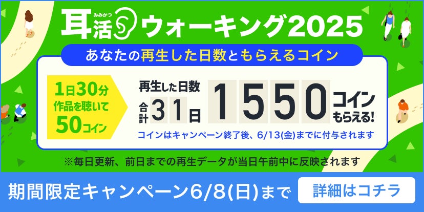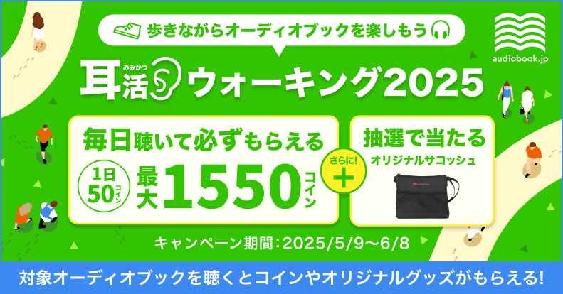 オーディオブック書籍ラインナップ数No.1(※1)の「audiobook.jp」を運営する株式会社オトバンク(本社:東京都文京区、代表取締役社長:久保田裕也、以下「オトバンク」)は、歩きながらオーディオブックを楽しむキャンペーン「耳活ウォーキング2025」を、2025年5月9日(金)〜6月8日(日)に開催します。