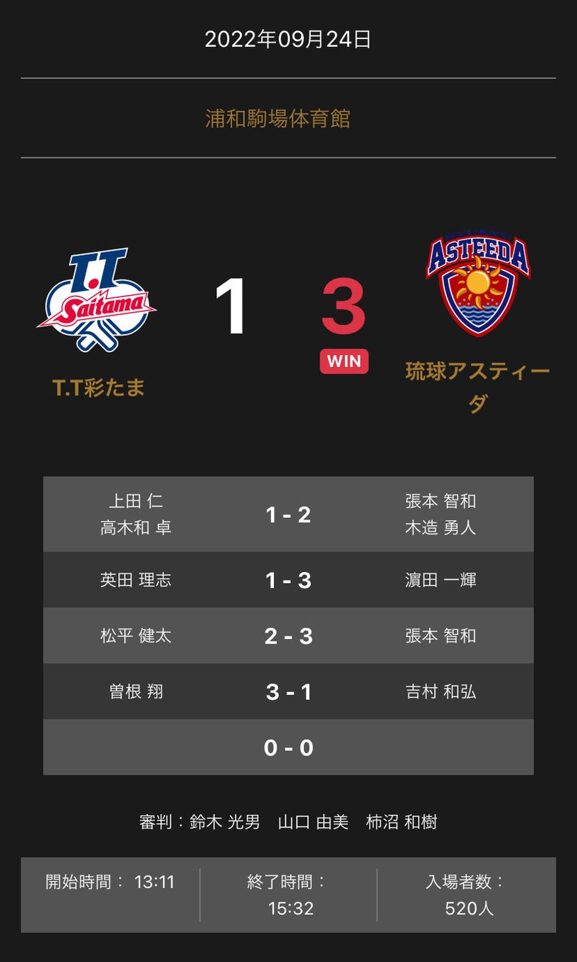 ノジマTリーグ 2022-2023シーズン 公式戦 9月24日開催 T.T彩たま vs 琉球アスティーダ 試合結果