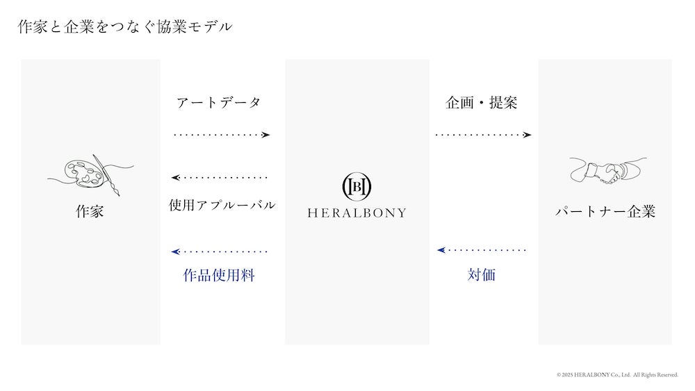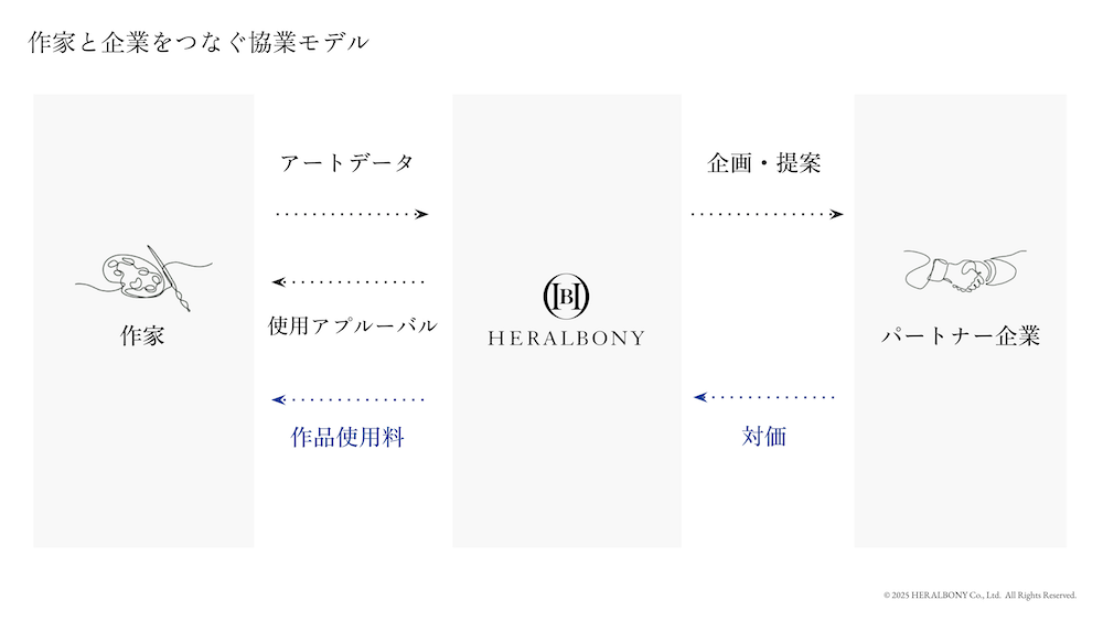 「異彩を、 放て。」をミッションに、障害のイメージ変容と福祉を起点に新たな文化の創出を目指すクリエイティブカンパニー。障害のある作家が描く2,000点以上のアート作品をIPライセンスとして管理し、正当なロイヤリティを支払うことで持続可能なビジネスモデルを構築。自社ブランド「HERALBONY」の運営をはじめ、企業との共創やクリエイティブを通じた企画・プロデュース、社員研修プログラムを提供するほか、国際アートアワード「HERALBONY Art Prize」の主催など、アートを軸に多角的な事業を展開しています。2024年9月より海外初の子会社としてフランス・パリに「HERALBONY EUROPE」を設立。