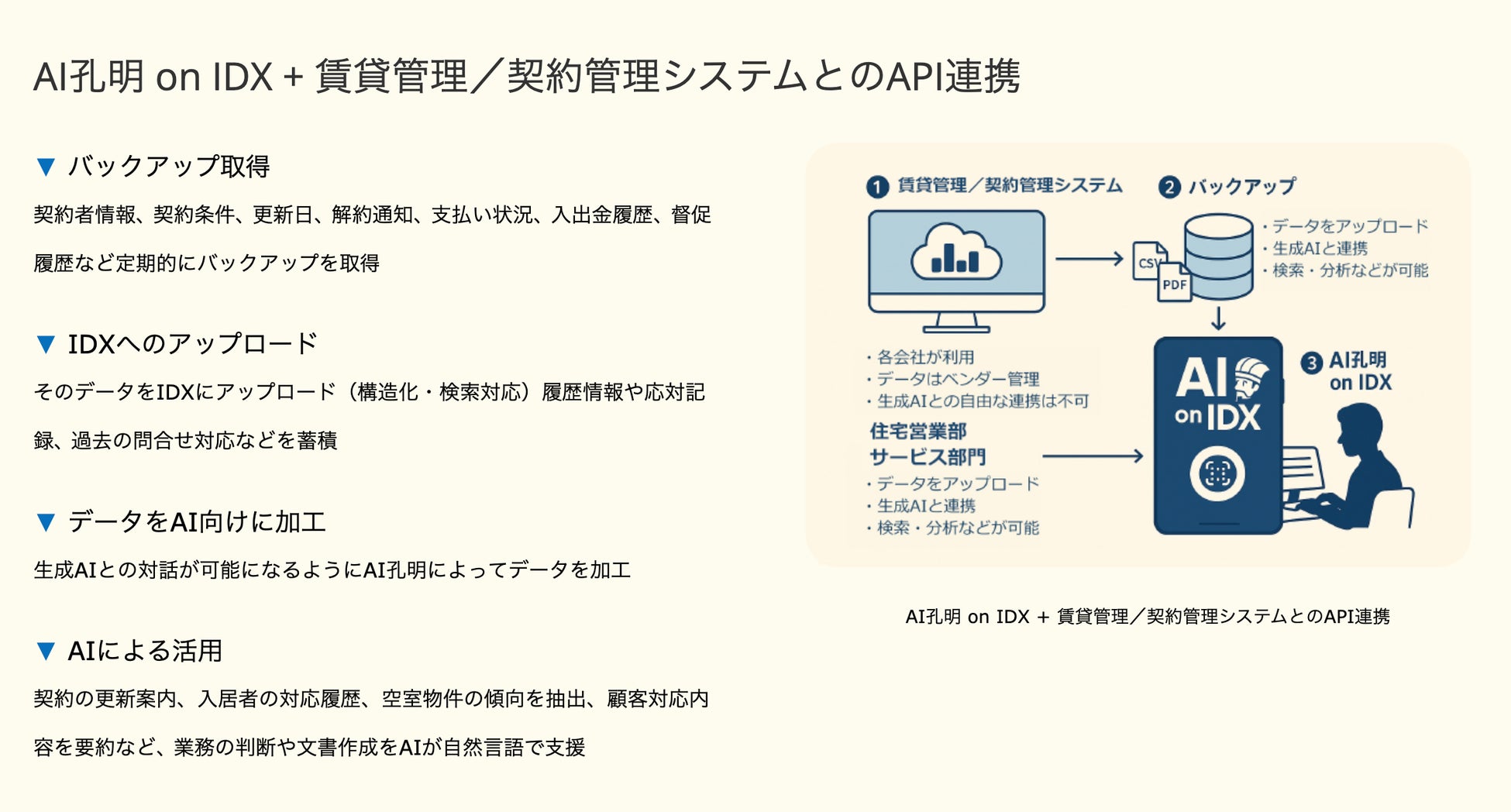 企業データとAIの利活用カンパニー、AIデータ株式会社(本社:東京都港区、代表取締役社長 佐々木隆仁、以下AIデータ社)は、賃貸・契約管理システム、入出金管理、更新・解約通知、顧客対応履歴などとの連携を前提に、不動産業務の効率化・契約管理の精度向上・顧客応対支援などをAIが行う「AI孔明™ on IDX for Real Estate」の提供を開始しました。