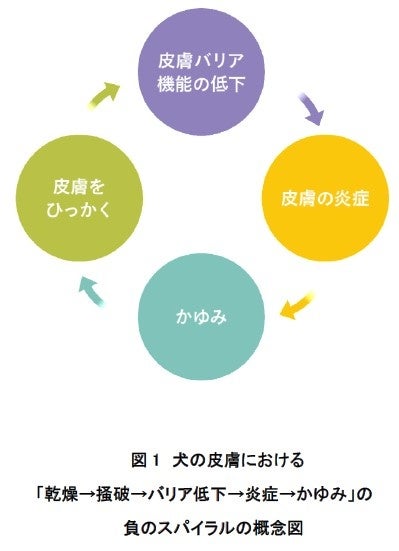 犬においても、図1のようなかゆみの負のスパイラルが形成されることが知られています。この悪循環は、皮膚の炎症の慢性化や再発の一因となるため、皮膚バリア機能を維持するスキンケアによる早期介入は皮膚の健康維持の一助となると考えられます。