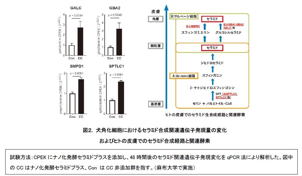 本研究により、これまで人で確認できていた当社独自セラミドであるナノ化発酵セラミドプラスによるセラミド経路の遺伝子発現上昇および抗炎症作用が、犬の皮膚細胞においても確認されました。ナノ化発酵セラミドプラスは、犬においても、皮膚バリア機能の向上や炎症抑制において重要な役割を担うことが示唆されました。