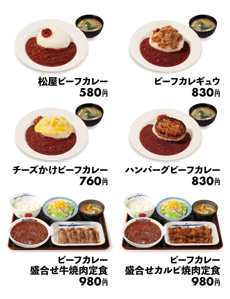 商品名 松屋ビーフカレー 580円 チーズかけビーフカレー 760円 ビーフカレギュウ 830円 ハンバーグビーフカレー 830円 ビーフカレー盛合せ牛焼肉定食 980円 ビーフカレー盛合せカルビ焼肉定食 980円 ※お持ち帰りいただけます。お持ち帰りにみそ汁は付きません。 お持ち帰りの場合、みそ汁は別途60円でお求めいただけます。 ※税込み価格です。 ※現在販売中(8/24時点)の「松屋ビーフカレー(680円)」関連商品は順次終売となります。 ※株主優待券は上記全てのメニューにご使用いただけます。