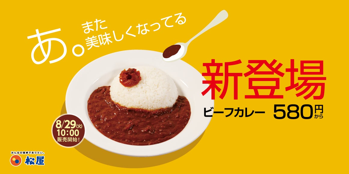 このたび松屋フーズ(本社:東京都武蔵野市、代表取締役社長:瓦葺一利)では、牛めし・カレー・定食・その他丼の「松屋」におきまして、2023年8月29日(火)午前10時より新「ビーフカレー」を580円で発売いたします。また、ビーフカレーの販売と同時に裏キャンペーンとして2023年8月29日(火)午前10時~10月31日(火)午前10時まで、たくさん食べて、たくさん応援!松屋の日本応援企画「牛めしあたま大盛30円引き」の実施、さらに牛めしサイズでは松屋初「牛めしあたま特盛」を期間限定で発売いたします。