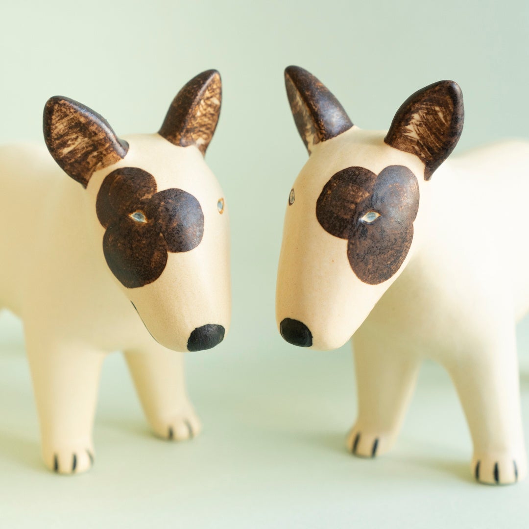 ブルテリアをモチーフにしたかわいらしい陶器です。1匹1匹、顔の模様の位置が違います。