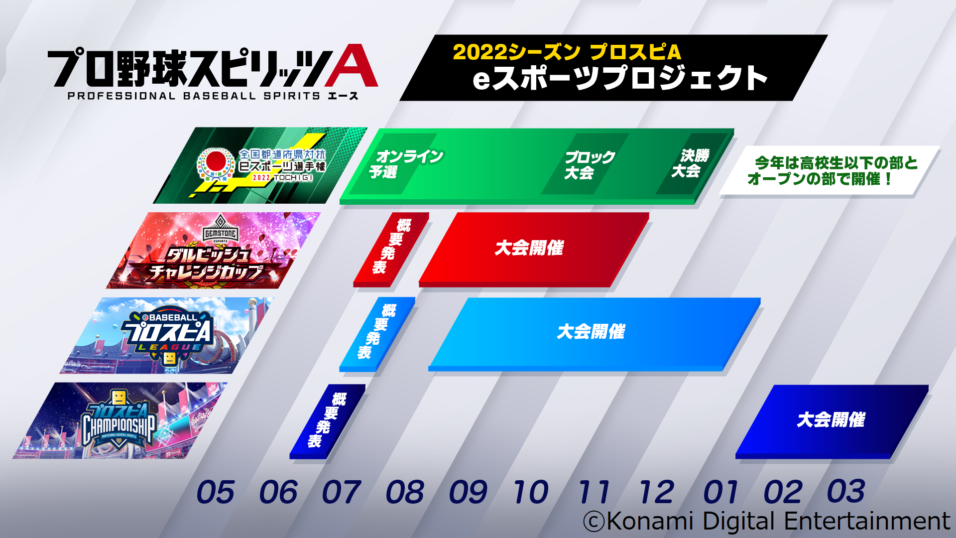 株式会社コナミデジタルエンタテインメントは、モバイルゲーム『プロ野球スピリッツA』(以下、『プロスピA』)を競技タイトルとした2022シーズンのeスポーツ大会について発表しました。