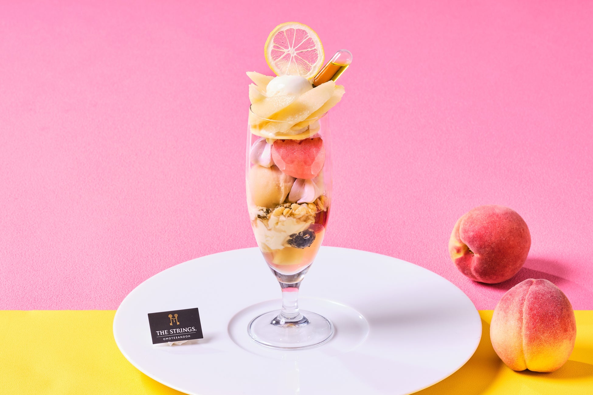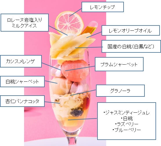 桃は白鳳など、その時期に一番良い状態の国産の桃をパティシエが厳選。レモンピールを漬けて香りづけをした自家製の「レモンオリーブオイル」をかけながらお楽しみください。パフェの上層ではレモンやプラム、カシスなどさっぱりとした夏らしい味わいを、下層部では杏仁やジャスミンティーの香りと甘い桃のマリアージュをご堪能いただけます。