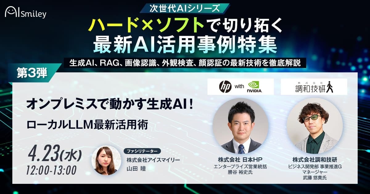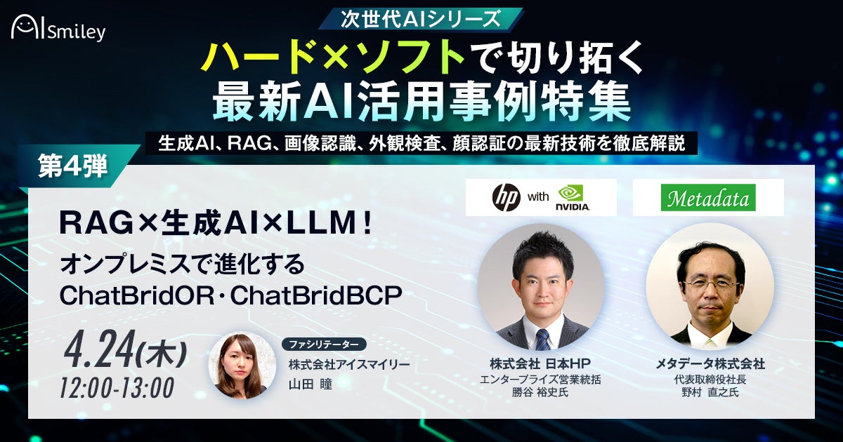 AIポータルメディア「AIsmiley」を運営する株式会社アイスマイリー(東京都渋谷区、代表取締役:板羽晃司)は、日本HPと最先端のAI企業を迎え、全4回開催の【次世代AIシリーズ】ウェビナーを開催します。