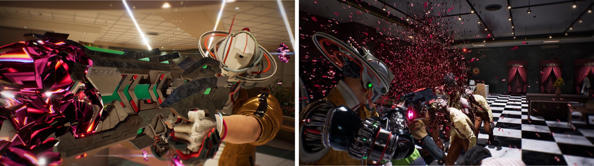本作の特徴は、爽快感あふれる「ブラッディアクション」。さまざまな武器を持ち変え、押し寄せる敵を蹴散らしていき、吹き荒れる血飛沫などのバイオレンスな表現で、より刺激的なアクションをお楽しみいただけます。