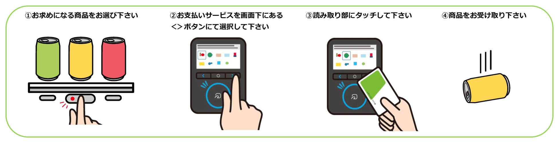 対象のアキュアの自販機に搭載のVM-30型マルチリーダライタの画面でJRE POINTのロゴを選択し、JRE POINT WEBサイトに登録したSuicaを決済端末にタッチすることでJRE POINTを利用した商品購入が可能です。