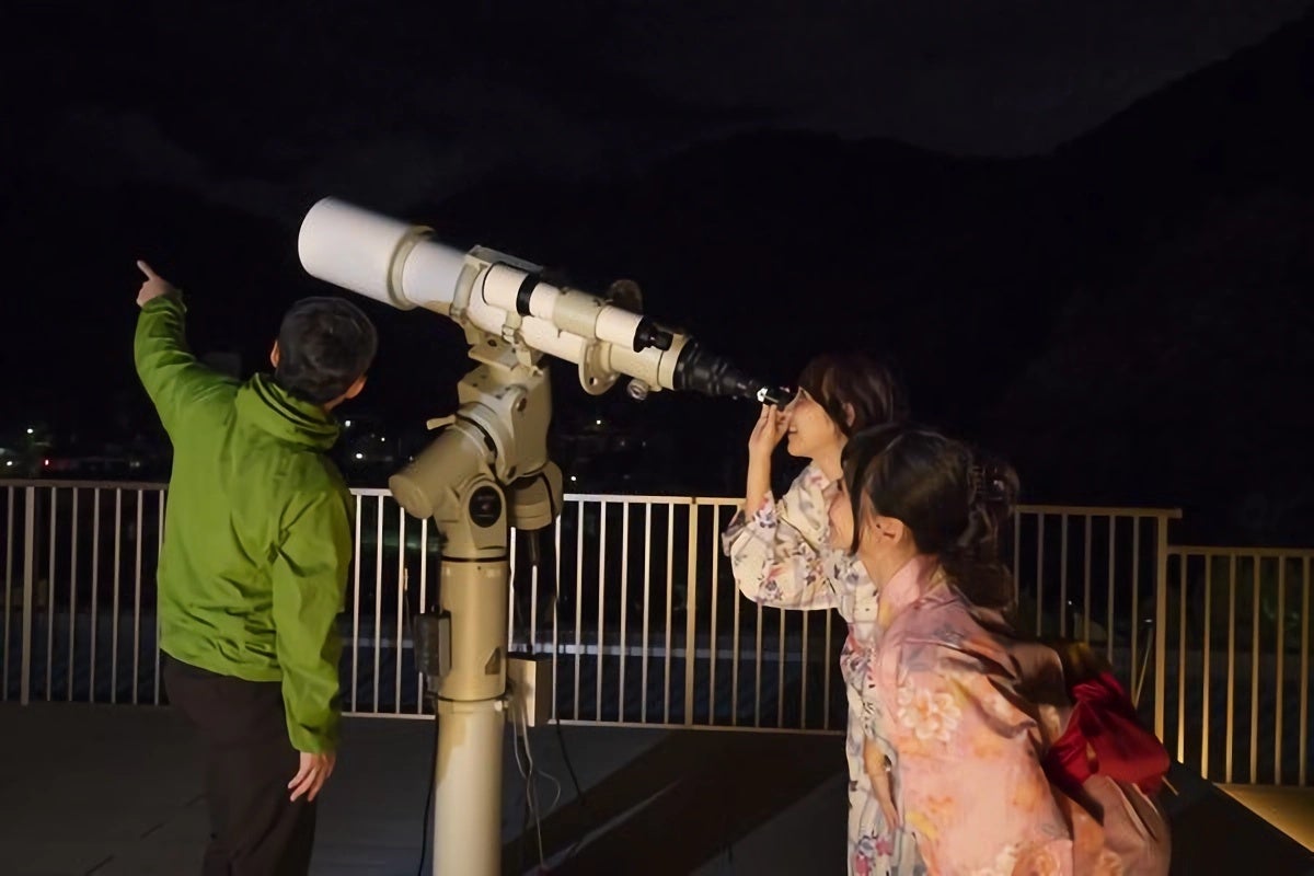 休暇村では滞在中に楽しめる各体験プログラムを用意しています。奥武蔵の「スタービューイング」は、月や今の時期しか見ることのできない土星を天体望遠鏡を使って観測します。さらに、今季は屋上にこたつを設置。こたつで温まりながら星空観察を楽しめます(1組限定)。