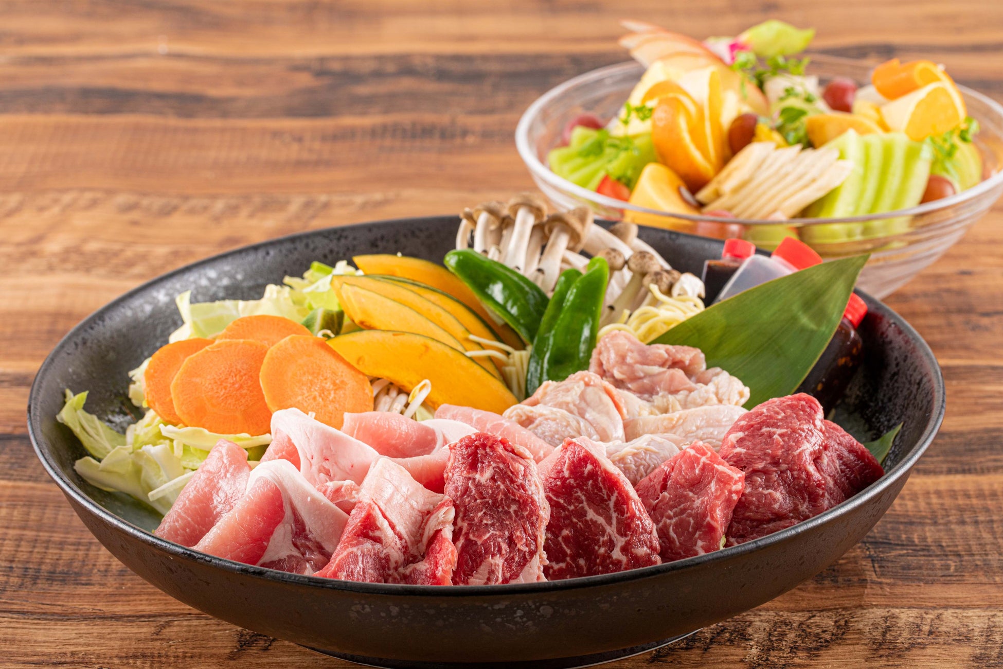 夕食はログハウスでBBQをお楽しみいただき、朝食はホテルのレストランでビュッフェをお楽しみいただく宿泊プランです。牛・豚・鶏3種のお肉やお野菜、焼きそば、食後にはカットフルーツをご用意した人気のBBQコースです。※冬季はログハウスの中で楽しめるようホットプレートをご用意します。