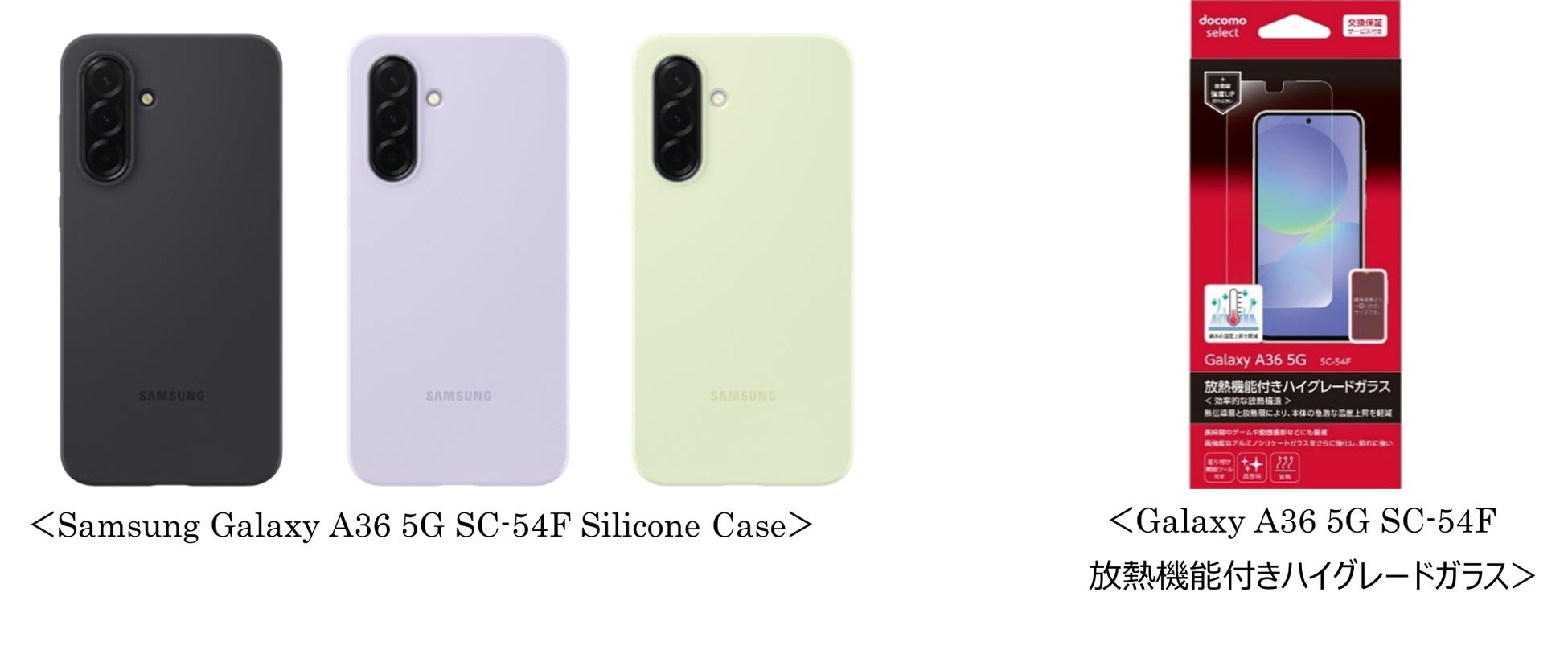「Samsung Galaxy A36 5G SC-54F」発売に併せ、スマートフォンのデザインとマッチしたSamsung社製純正ケースを発売いたします※5。また、長時間のゲームや動画撮影などによるスマートフォンの急激な温度上昇を軽減する「放熱機能付きハイグレードガラス」を発売いたします。詳しくは、ドコモオンラインショップをご確認ください。