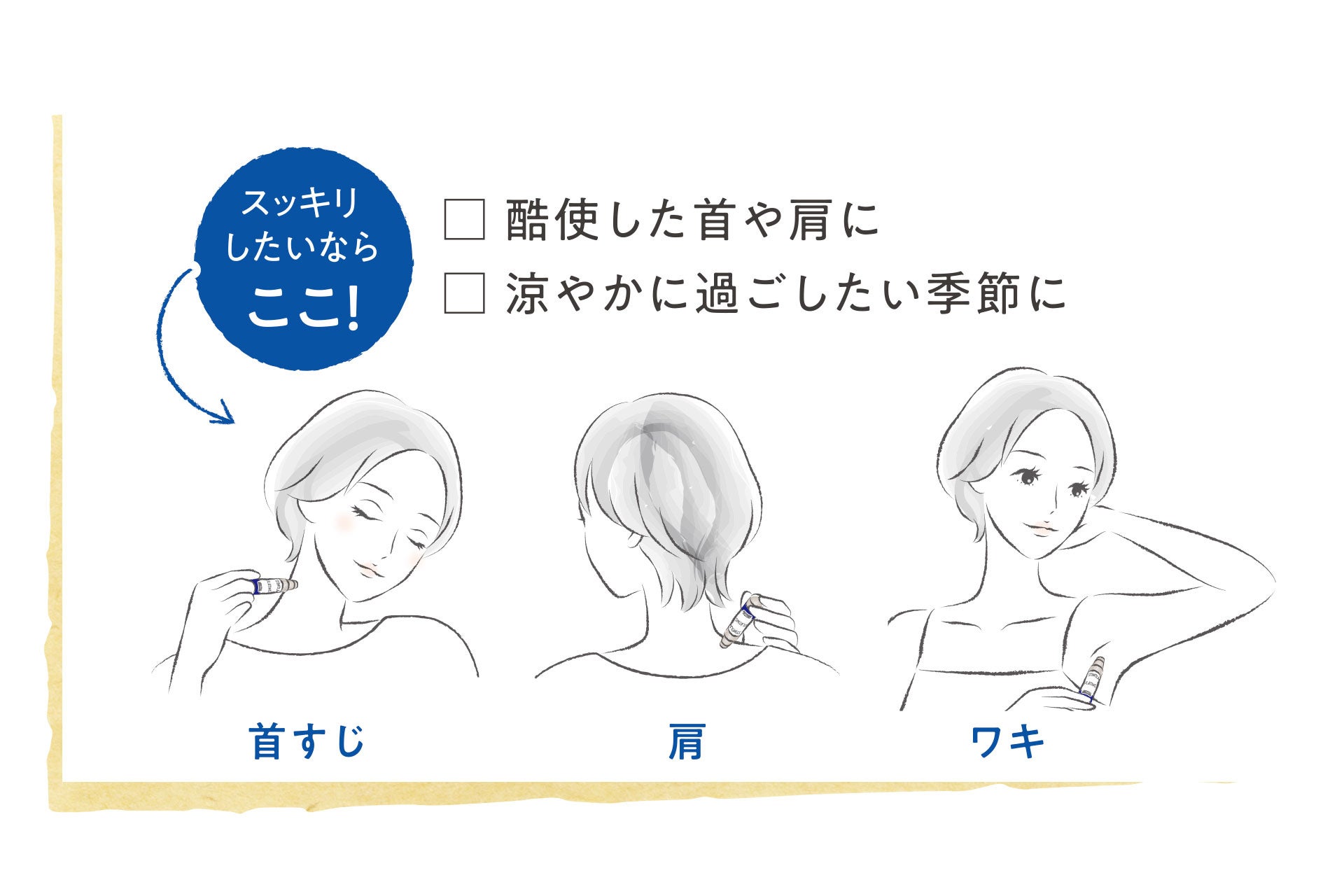 こめかみや首・肩まわりに直接コロコロと塗布してください。リフレッシュしたい時など、一日に何度でも使えます。