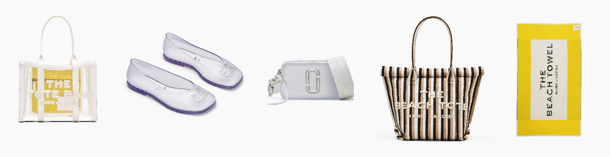 左から、ザ クリア トート バッグ ミディアム ¥56,100 / Melissa x Marc Jacobs Ruby バレリーナ ¥24,200 / ザ ジェリー スナップショット ¥47,300 / ザ ストライプ ウーブン ビーチ トート バッグ ¥56,100 / ザ ビーチ タオル ¥15,400 ※税込価格表記