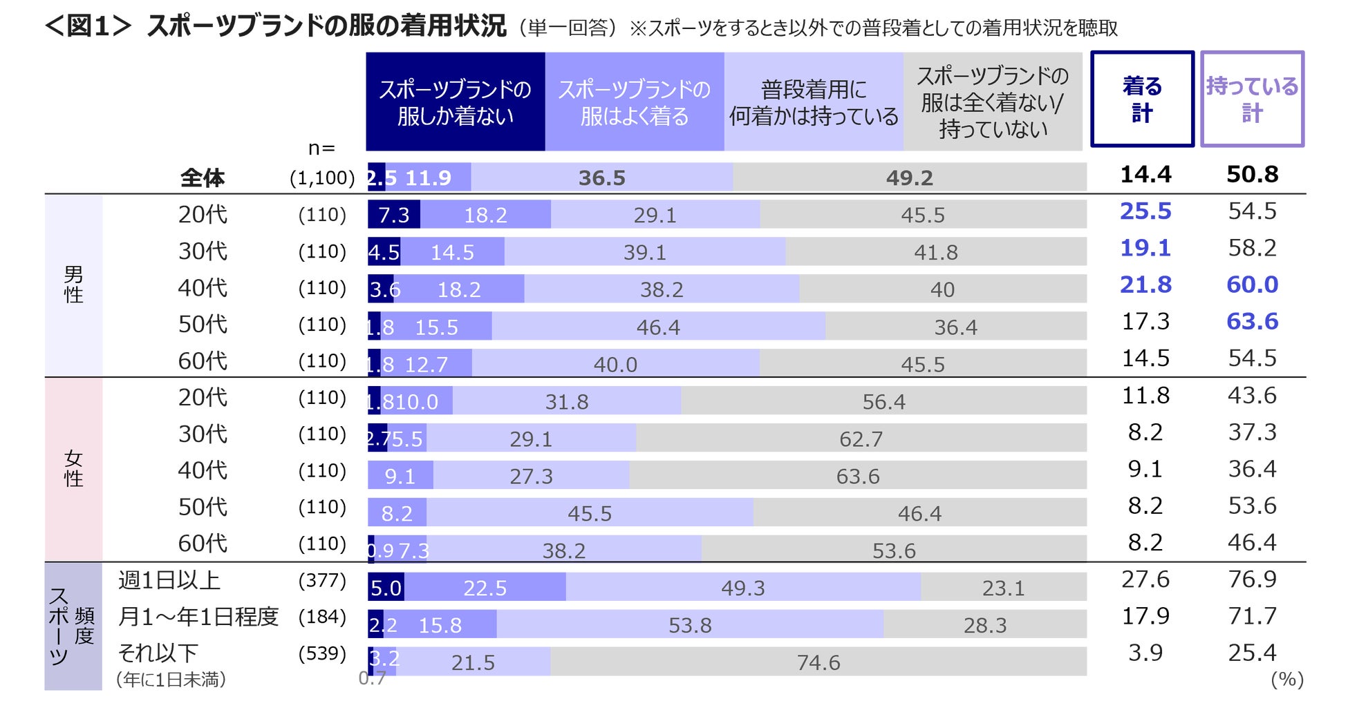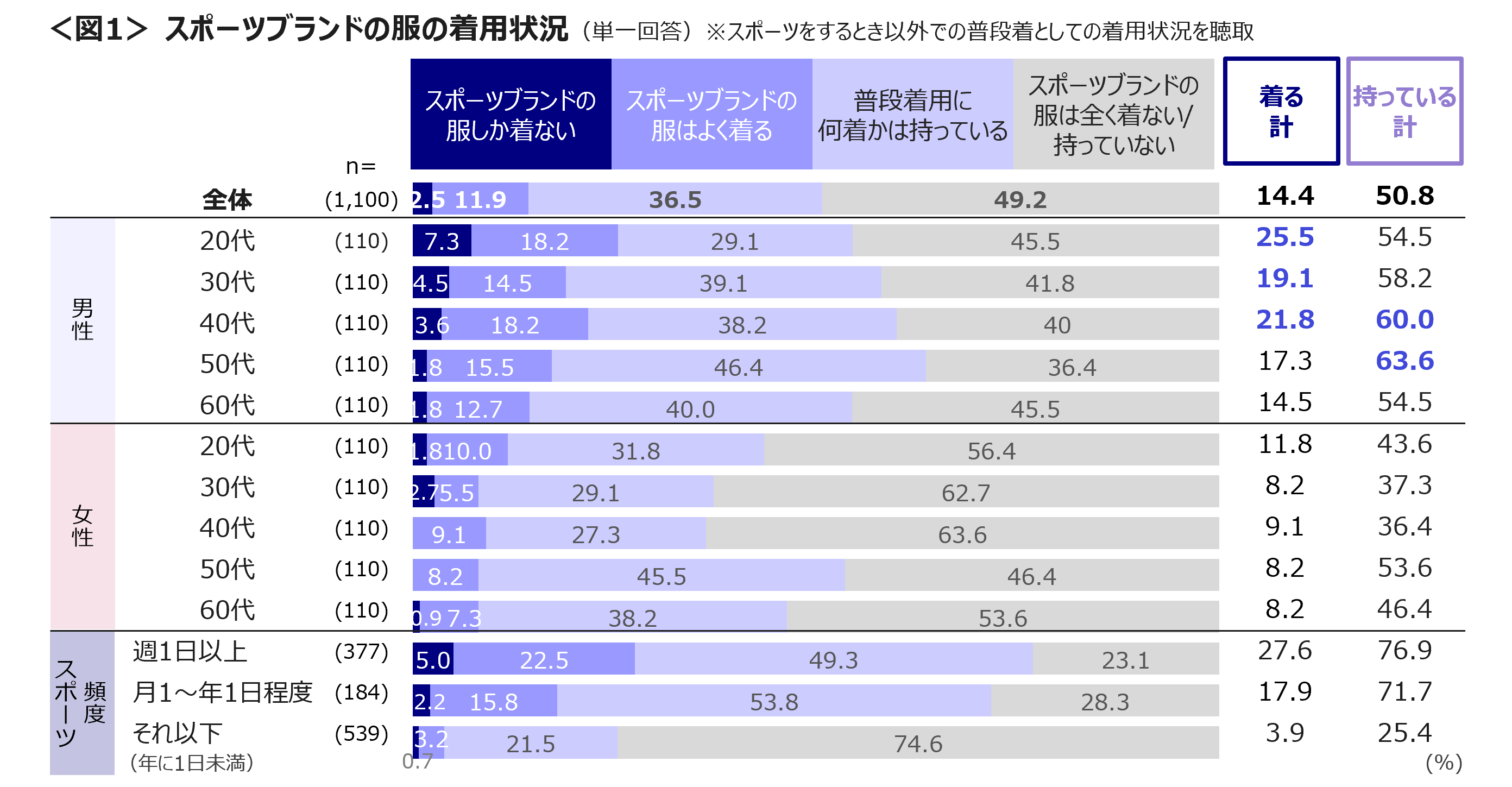 スポーツブランドの服を持っている人は50.8%で、普段、着ている人は14.4%。