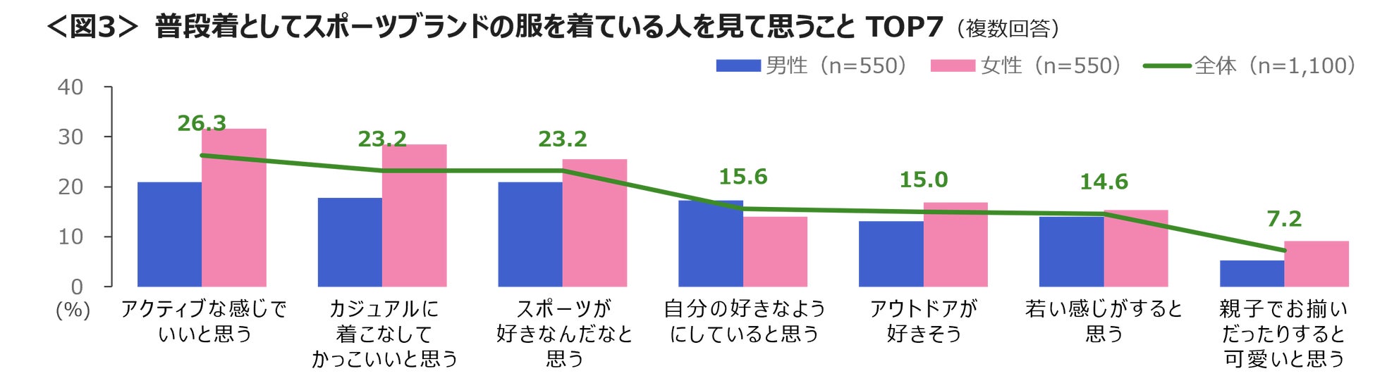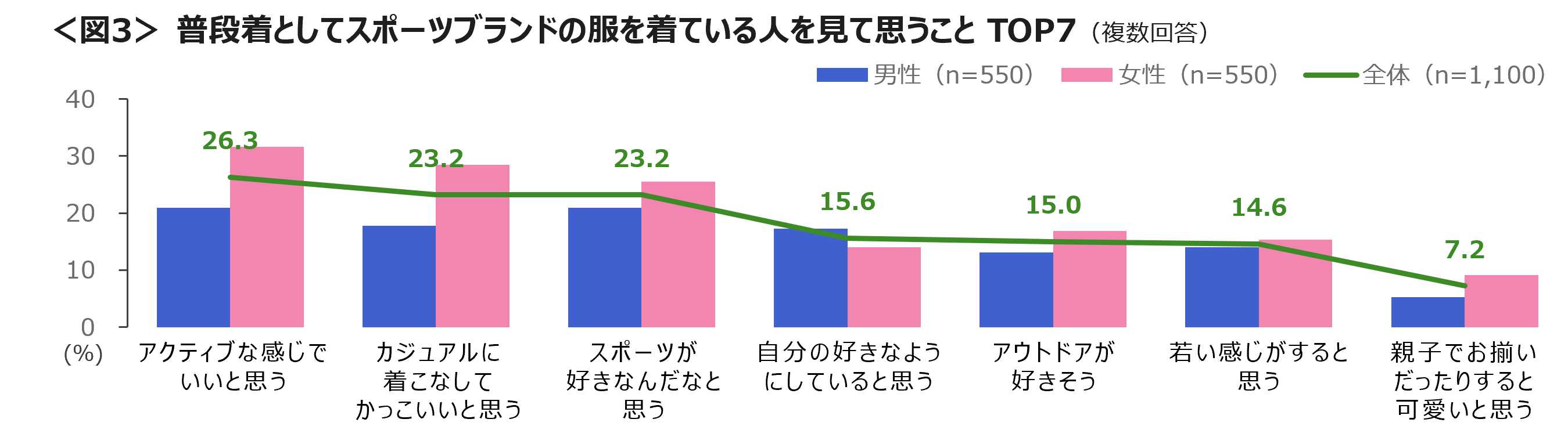 女性の方が「アクティブな感じでいいと思う」「カジュアルに着こなしてかっこいいと思う」などポジティブなイメージが高い。<図3>
