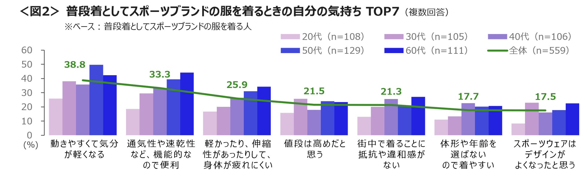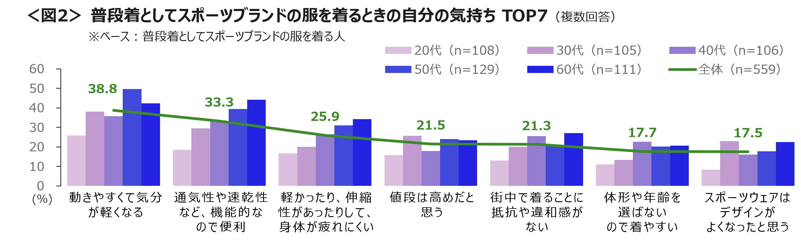 上位3項目は特に50代・60代で高く、機能性の高さから着用されている傾向がみられる。<図2>