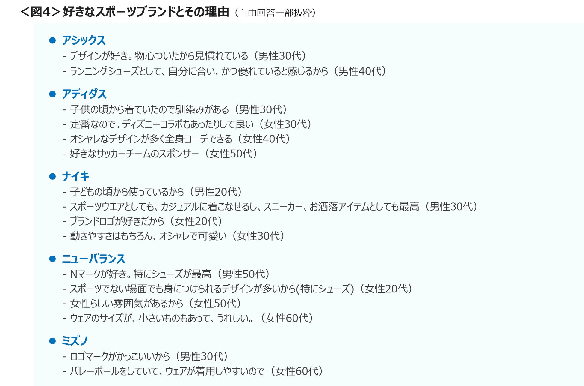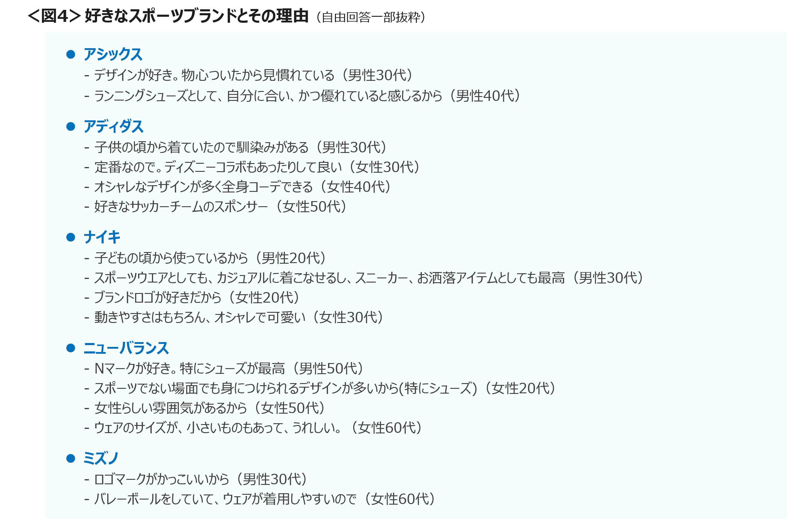 好きなスポーツブランドは「アシックス」「アディダス」「ナイキ」「ニューバランス」「ミズノ」などがあげられ、好きな理由としては「子どもの頃から着ているので馴染みがある」「ロゴ・デザインが好き」といった回答がみられた。<図4>