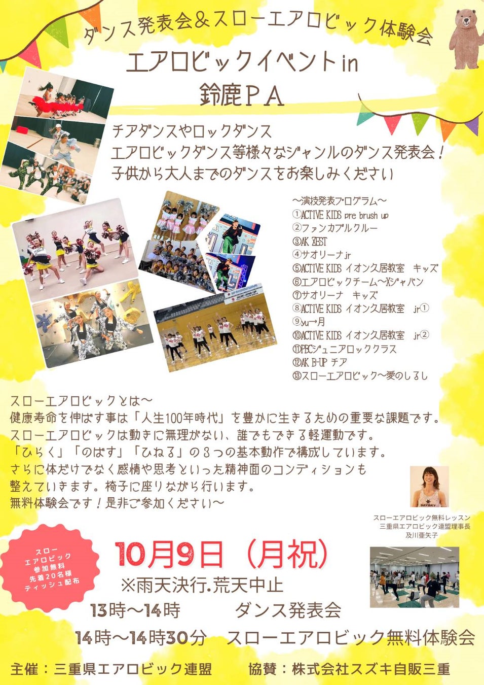 当日は、三重県エアロビック連盟に所属するチームが、チアダンス、ロックダンス、エアロビダンスなど、様々な演目を披露します。