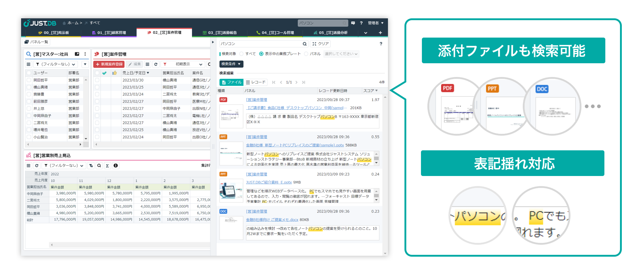 「JUST.DB」に登録されたすべてのテキストや添付ファイルに対し、高速で高度な検索が可能です。大文字/小文字、全角/半角、カナ末尾の長音有無などの「表記揺れの吸収」、検索条件との関連性が高いデータを抽出する「スコアリング」、社内や業界内の独自用語が個別登録可能な「同義語展開」といった検索にも対応しています。日本語変換や検索エンジンの開発で培った日本語処理技術により、高度な検索機能や辞書を搭載し、快適で効率の良い情報活用を実現します。