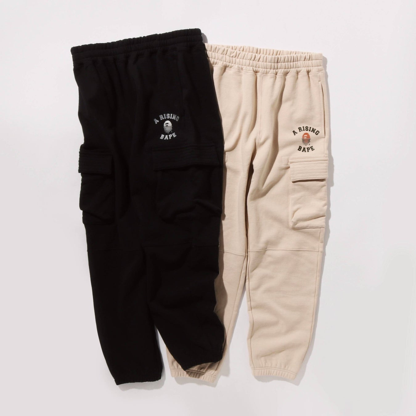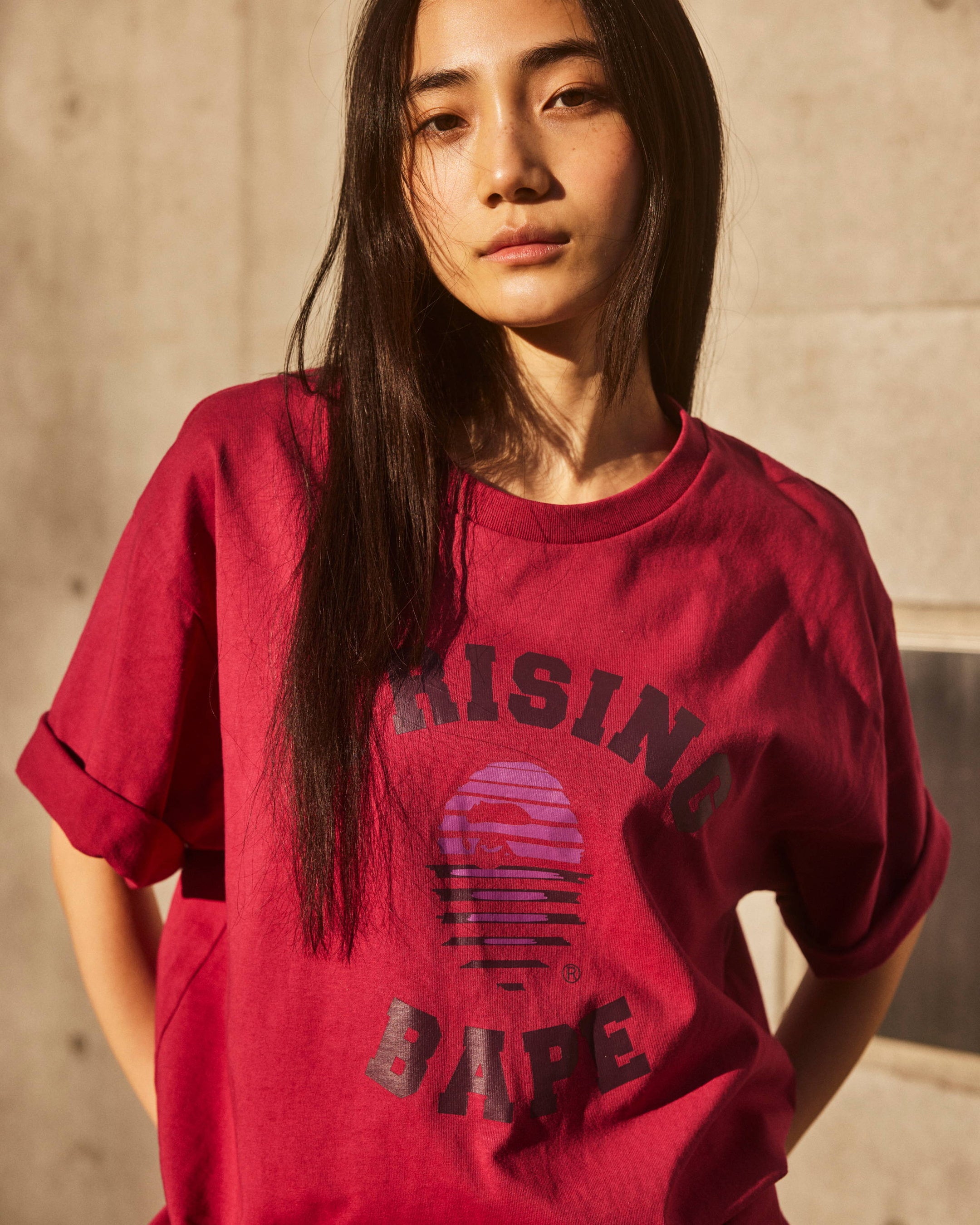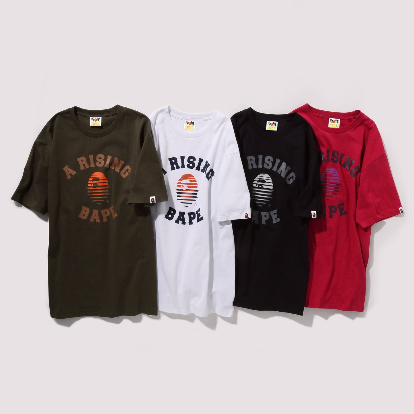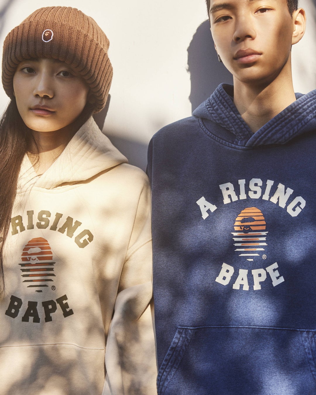 第1弾は「日の出」をモチーフにしたバイカラーのAPE HEADをカレッジロゴのグラフィックに落とし込み、Tシャツ、フーディ、スウェットパンツをラインアップしました。