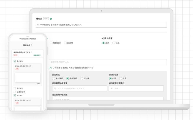 「やくばとWeb問診」は、クリニックの問診票作成から患者さまの回答内容の管理、電子カルテへの転記までをWeb上で完結できるシステムです。